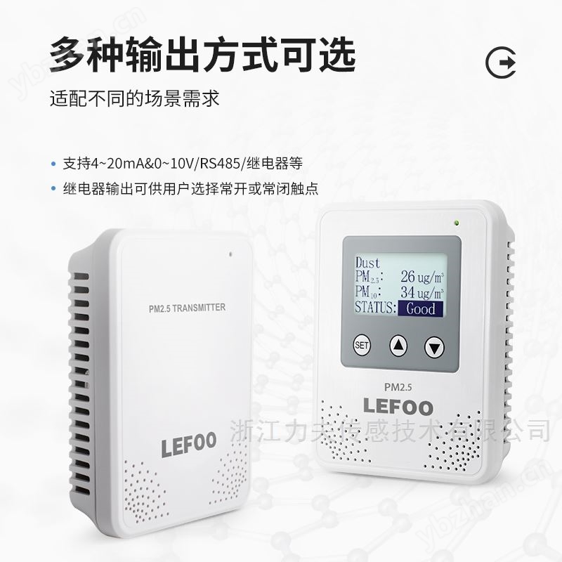 LFG303 PM2.5/10室内粉尘变送/控制器采用了激光粉尘传感器,对环境中的PM2.5或PM10浓度进行测量,传感器使用寿命长,免维护,反应迅速,性能稳定,准确性高;供电范围宽,完善的过压及反接保护,可提供电流和电压或RS485输出信号:选配继电器输出时,配备显示屏和按键后能设置不同的继电器工作模式,配合蜂鸣器,能实现较全面的独立控制/报警功能;提供六色LED指示灯直观提示环境污染程度;室内粉尘变送/控制器体积小巧、安装简单;可广泛应用于各类商业综合体、智能楼宇办公环境、医院、学校等场所的空气质量监测。